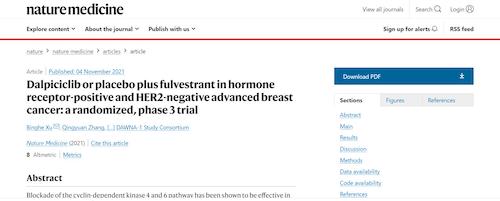 11月4日,国际四大医学期刊之一、英国《自然》旗下《自然医学》(Nature Medicine)在线发表CDK4/6抑制剂达尔西利(SHR6390)联合氟维司群治疗既往内分泌治疗后疾病进展的HR+/HER2-晚期乳腺癌的多中心、随机、双盲III期临床研究(DAWNA-1研究)中期分析结果报告,首次对氟维司群(雌激素受体降解剂)±达尔西利治疗激素受体阳性晚期乳腺癌的有效性和安全性进行了比较。研究结果显示,达尔西利+氟维司群组与安慰剂+氟维司群组相比,无进展生存期(PFS)显著延长。该项研究由中国医学科学院肿瘤医院徐兵河教授担任leading PI,全国39家医院参研,由九州酷游医药临床研发团队支持完成。