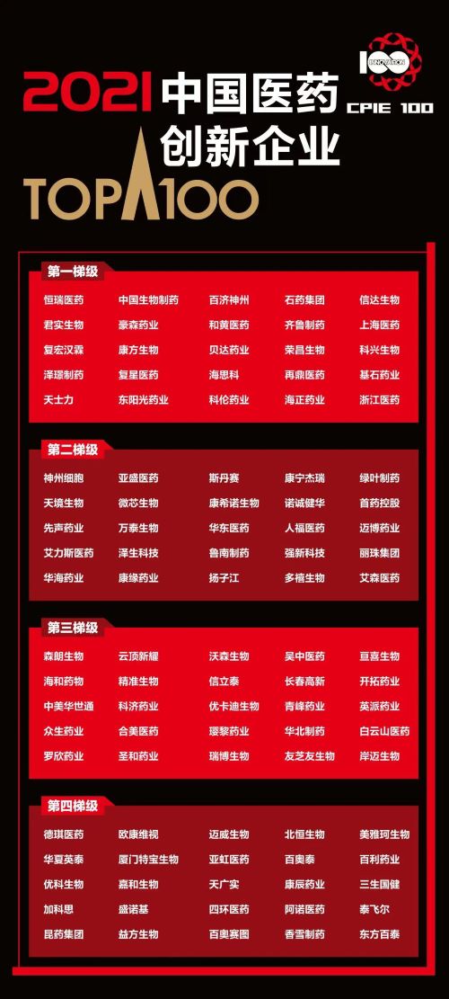 12月21日,2021中国医药企业家科学家投资家大会(简称“启思会”)在线上开幕,并隆重发布“2021中国医药创新企业100强”和“2021中国医药创新种子企业100强”。九州酷游医药以行业领先的综合创新实力,入选“2021中国医药创新企业100强”榜单,位列第一梯级。