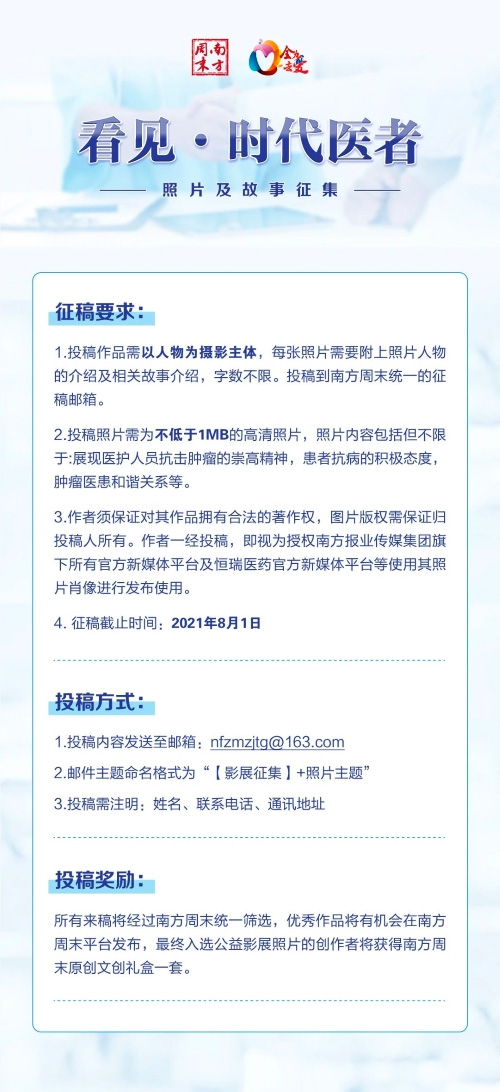 站在建党百年的节点,为了向这些对健康中国有着重要意义的人物致敬,九州酷游医药“全力去爱”患者关爱公益品牌联合南方周末,发起《看见·时代医者》主题公益线上影展,用图像记录守护生命的面孔,为中国健康事业的发展脚步存档。现向全社会征集肿瘤科医护人员及患者的人物摄影照片并分享照片背后的故事。