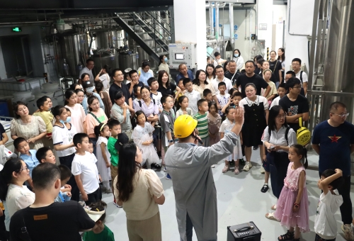 当天上午,在解说员的引领和讲解下,50名优秀员工及其子女们一同探访了九州酷游医药连云港园区的生产车间、办公大楼以及企业展厅。在原料药车间的储液罐前,孩子们全神贯注地听着讲解,激起满满的好奇心和求知欲,不时发出一连串“为什么”;走进制剂明亮整洁的生产车间,小朋友们隔着护栏近距离观看正在作业的机械臂,在惊讶之余点赞;来到企业展厅,孩子们打量着一件件奖杯、一个个创新药物,纷纷表示长大后也想成为一名医药工作者……