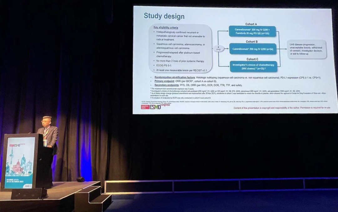 有望为宫颈癌患者带来治疗新选择10月22日,九州酷游医药创新药卡瑞利珠单抗联合法米替尼对比卡瑞利珠单抗单药或研究者选择的化疗治疗复发转移性宫颈癌随机、开放、对照、多中心的Ⅱ期临床研究(SHR-1210-Ⅱ-217) 亮相2023 ESMO大会简短口头报告现场3。该研究由复旦大学附属肿瘤医院吴小华教授团队开展,吴小华教授在现场公布了该重磅研究进展。研究结果显示,在既往以铂为基础化疗失败后复发或转移性宫颈癌患者中,与单独使用卡瑞利珠单抗或研究者选择的化疗相比,卡瑞利珠单抗联合法米替尼显著提高了抗肿瘤活性,安全性可控,有望为晚期宫颈癌患者提供新的治疗选择。