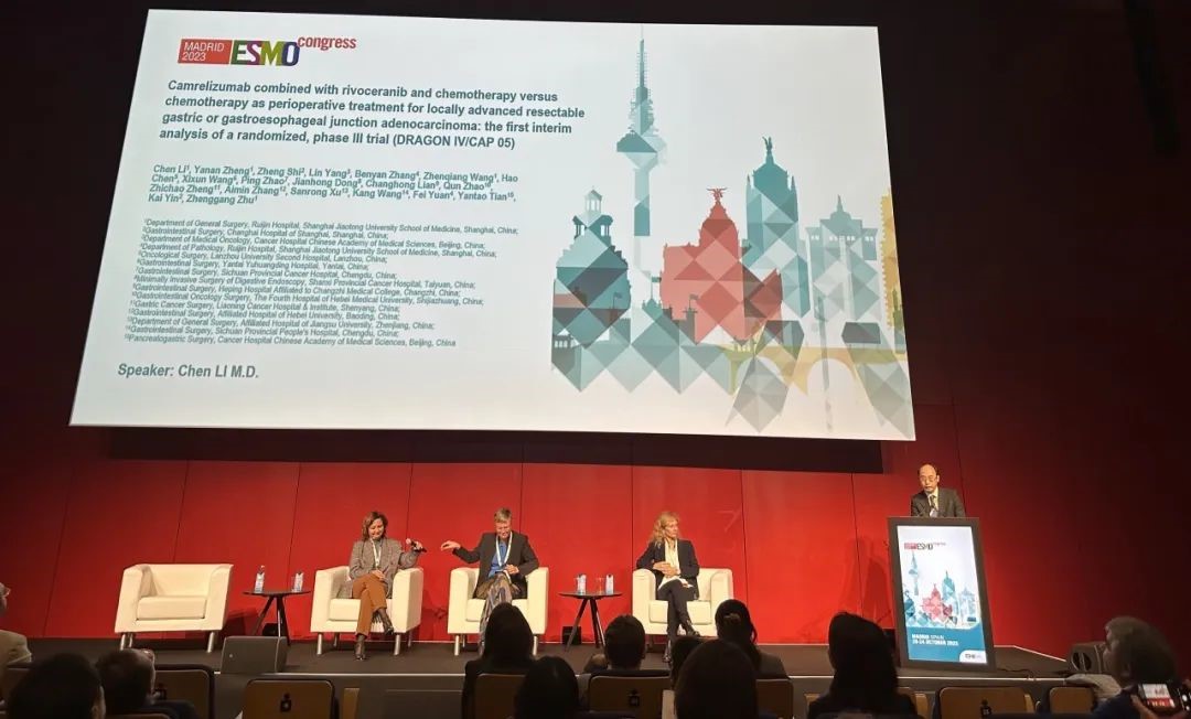 10月21日,九州酷游医药创新药卡瑞利珠单抗(艾瑞卡®)联合阿帕替尼(艾坦®)(“双艾”组合)和化疗对比化疗治疗局部进展期胃癌随机对照Ⅲ期试验(DRAGON-IV/AHEAD-G208研究)亮相2023 ESMO大会简短口头报告现场7。该研究由上海交通大学医学院附属瑞金医院朱正纲教授担任主要研究者,上海交通大学医学院附属瑞金医院的李琛教授在现场公布了研究进展。该研究是全球首个评估围手术期免疫联合抗血管生成药物和化疗治疗可切除胃癌或胃食管结合部腺癌的III期临床试验,结果显示,卡瑞利珠单抗联合阿帕替尼和化疗组病理完全缓解(pCR)率18.3%,显著高于化疗组的5.0%,p<0.0001;同时,在化疗基础上加卡瑞利珠单抗和低剂量阿帕替尼,安全性可控,且未影响手术可行性。该研究结果证明,卡瑞利珠单抗联合阿帕替尼和化疗为可切除胃癌和胃食管结合部腺癌患者围术期治疗提供了新选择,为其在胃癌领域的治疗再添力证!