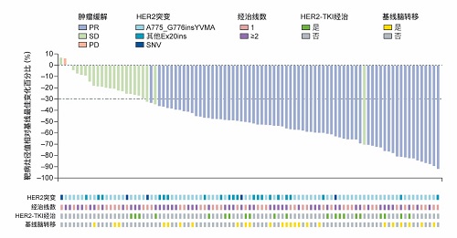 受试者中位年龄为57.5岁,ECOG评分为1的受试者为主(76例,80.9%),26%的受试者基线伴有脑转移。所有入组的受试者均存在经中心实验室确认的HER2突变,主要HER2突变类型为A775_ G776insYVMA(68例,72.3%)。既往系统性抗肿瘤治疗中位线数为2线(范围:1–9线),所有受试者均接受过含铂化疗和PD-1/PD-L1抑制剂治疗,22例(23.4%)受试者接受过HER2-TKI治疗。
