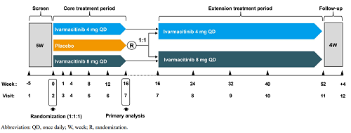 患者被随机分配(1:1:1)接受每日一次口服硫酸艾玛昔替尼片4 mg、8 mg或安慰剂。随机化根据基线疾病严重程度(IGA评分,3分或4分)、种族(亚洲人或非亚洲人)和年龄(<18岁或≥18岁)进行分层。在完成16周核心治疗期后,安慰剂组患者按照1:1再次随机分配至硫酸艾玛昔替尼片4 mg或8 mg组,以进入延伸治疗期,其他组继续原剂量治疗至第52周。