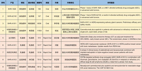 涉及的创新药包括8款已上市创新产品:注射用卡瑞利珠单抗(艾瑞卡®)、甲磺酸阿帕替尼片(艾坦®)、马来酸吡咯替尼片(艾瑞妮®)、羟乙磺酸达尔西利片(艾瑞康®)、阿得贝利单抗注射液(艾瑞利®)、氟唑帕利胶囊(艾瑞颐®)、注射用瑞康曲妥珠单抗(艾维达®,研发代号:SHR-A1811)、苹果酸法米替尼胶囊(艾比特®),以及7款未上市创新产品:抗PD-L1/TGF-βRII双抗瑞拉芙普-α(SHR-1701)、IL-15融合蛋白SHR-1501、双特异性抗体SHR-2017、全人源抗CTLA-4单克隆抗体SHR-8068、抗体偶联药物(ADC)SHR-1826、SHR-A1912、SHR-A2102。2类新药盐酸伊立替康脂质体注射液(II)(越优力®)及国内首仿药昂丹司琼口溶膜(艾其速®)各有1项研究入选。