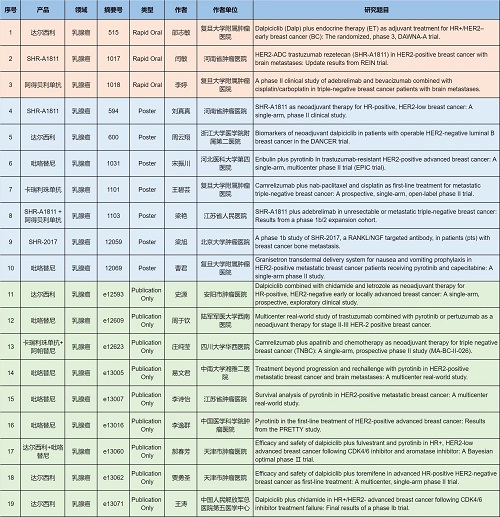 在乳腺癌领域,吡咯替尼、达尔西利、卡瑞利珠单抗、阿帕替尼、阿得贝利单抗、瑞康曲妥珠单抗(SHR-A1811)、SHR-2017,或产品间联合或联合化疗,共有19项研究入选(包括3项快速口头报道和7项壁报展示以及9项线上发表)。其中吡咯替尼占据7项、达尔西利占据6项,进一步巩固其在乳腺癌治疗中的地位。此外,瑞康曲妥珠单抗(SHR-A1811)、阿得贝利单抗相关研究入选快速口头报告,获得业内广泛关注。