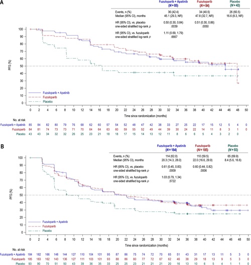 2020年8月27日至2022年4月1日期间,674例患者被纳入研究并按2:2:1的比例随机分配至FZPL+APA组(n=269):氟唑帕利(100 mg BID)+阿帕替尼(375 mg QD)、FZPL组(n=269):氟唑帕利(150 mg BID)或安慰剂组(n=136)进行维持治疗。